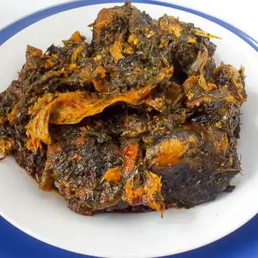 A plate of Afank with cow tail and garri or fufu