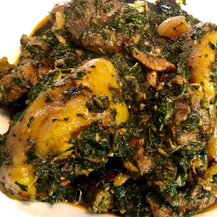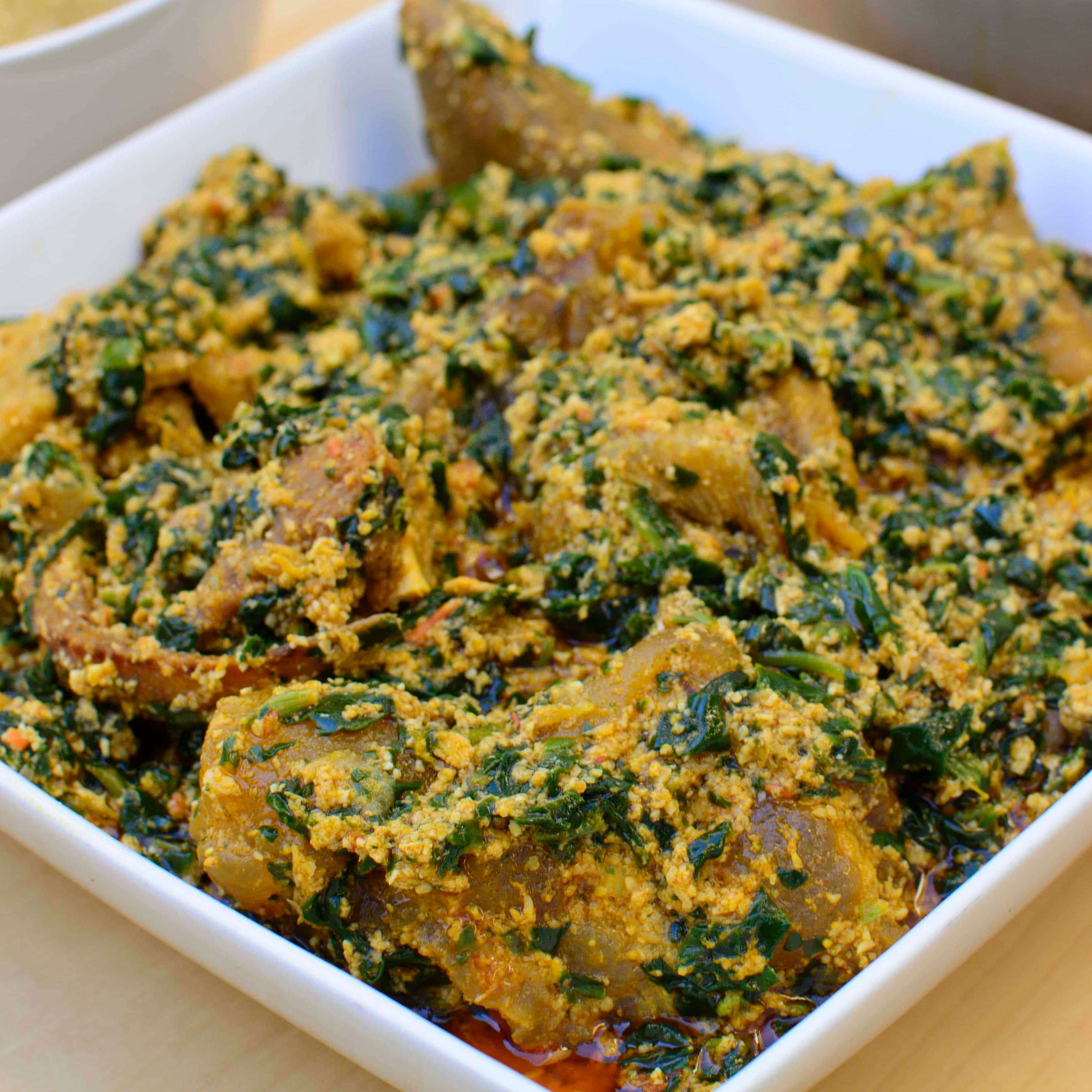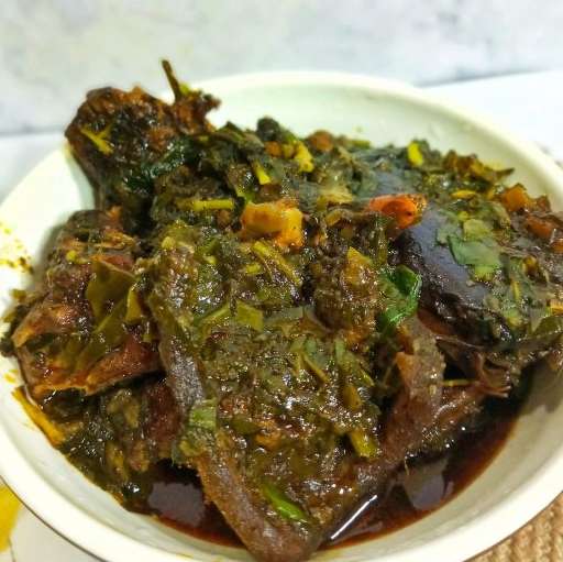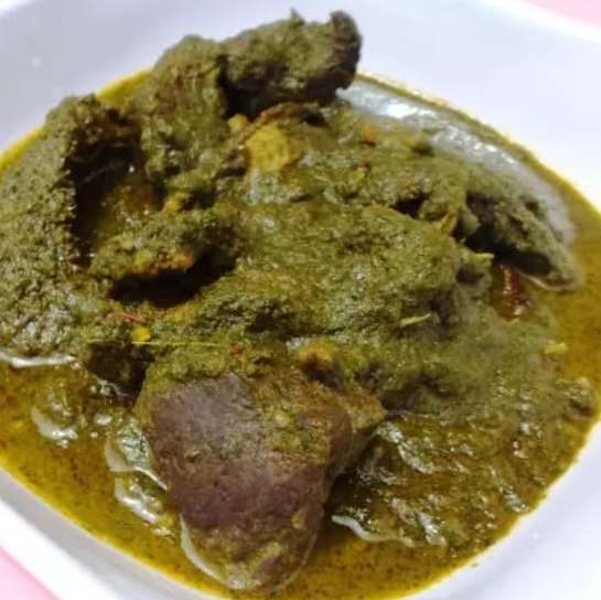 A plate of Afang with beef and semo or wheat