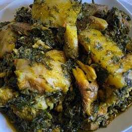 A plate of Afank with chicken and semo or wheat